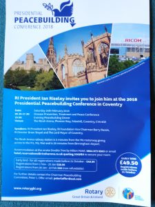 Rotary International President Ian Riseley is holding a Peacebuilding Conference on 24 February 2018 at the Ricoh Arena in Coventry. Hopefully, some Club members from Bromsgrove will attend, and we hope to sponsor a number of students from local secondary schools to attend with their teachers. We are delighted that the RI President has chosen Rotary District 1060 in which to hold this conference, which addresses one of the six areas of focus for Rotarians, viz. Peace and Conflict Resolution, encompassing one of the world’s most critical humanitarian needs.