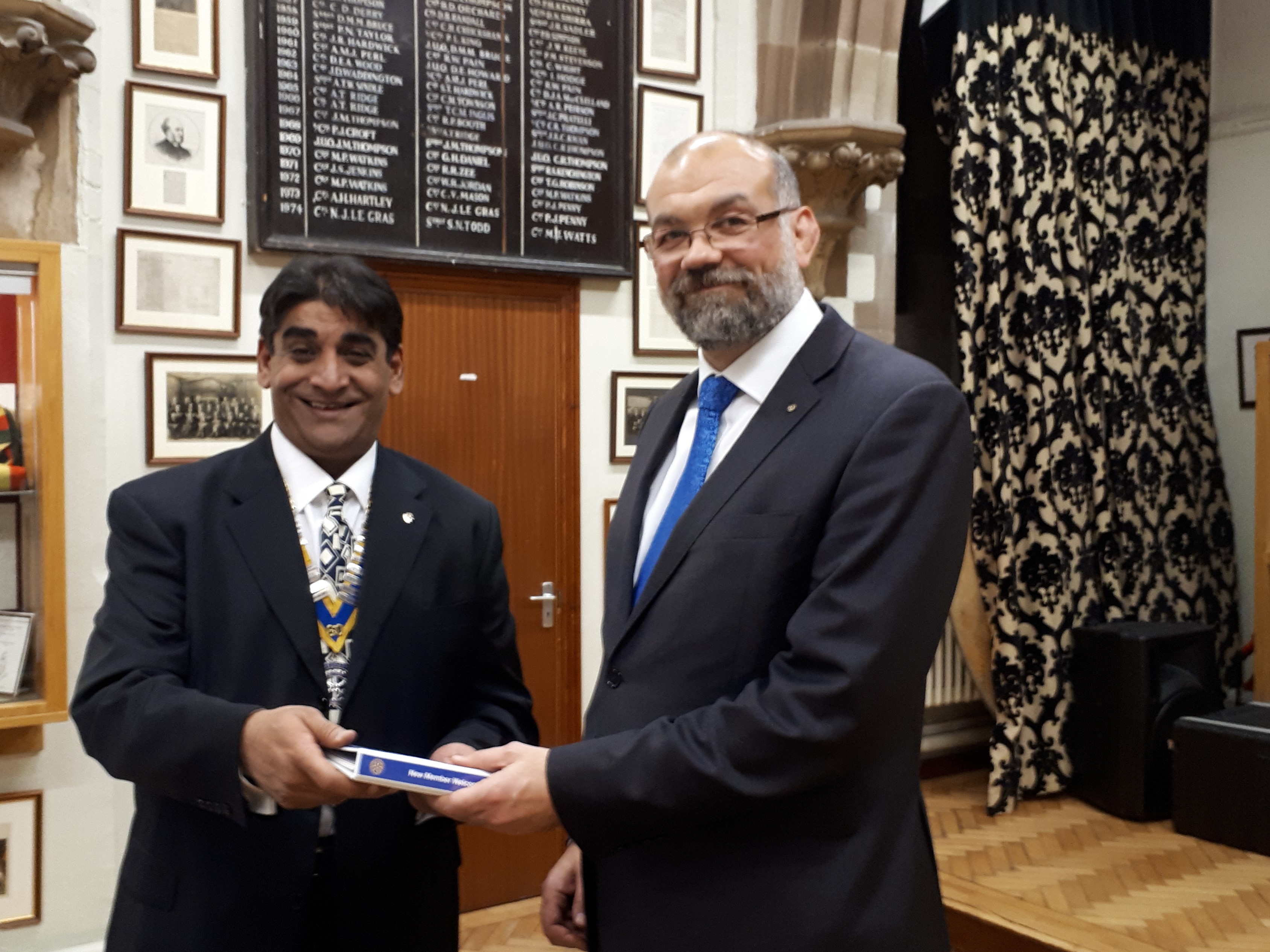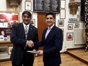At a Fellowship Meeting on 28 November 2017 held in Old Chapel at Bromsgrove School two new members were inducted by Amal Rampal President of the Rotary Club of Bromsgrove. Pictured left is Chris Smith Headteacher of South Bromsgrove High School receiving his Rotary New Member Guide; and right Vikas Sehdeva, who is a lawyer with his own practice in Barnt Green.