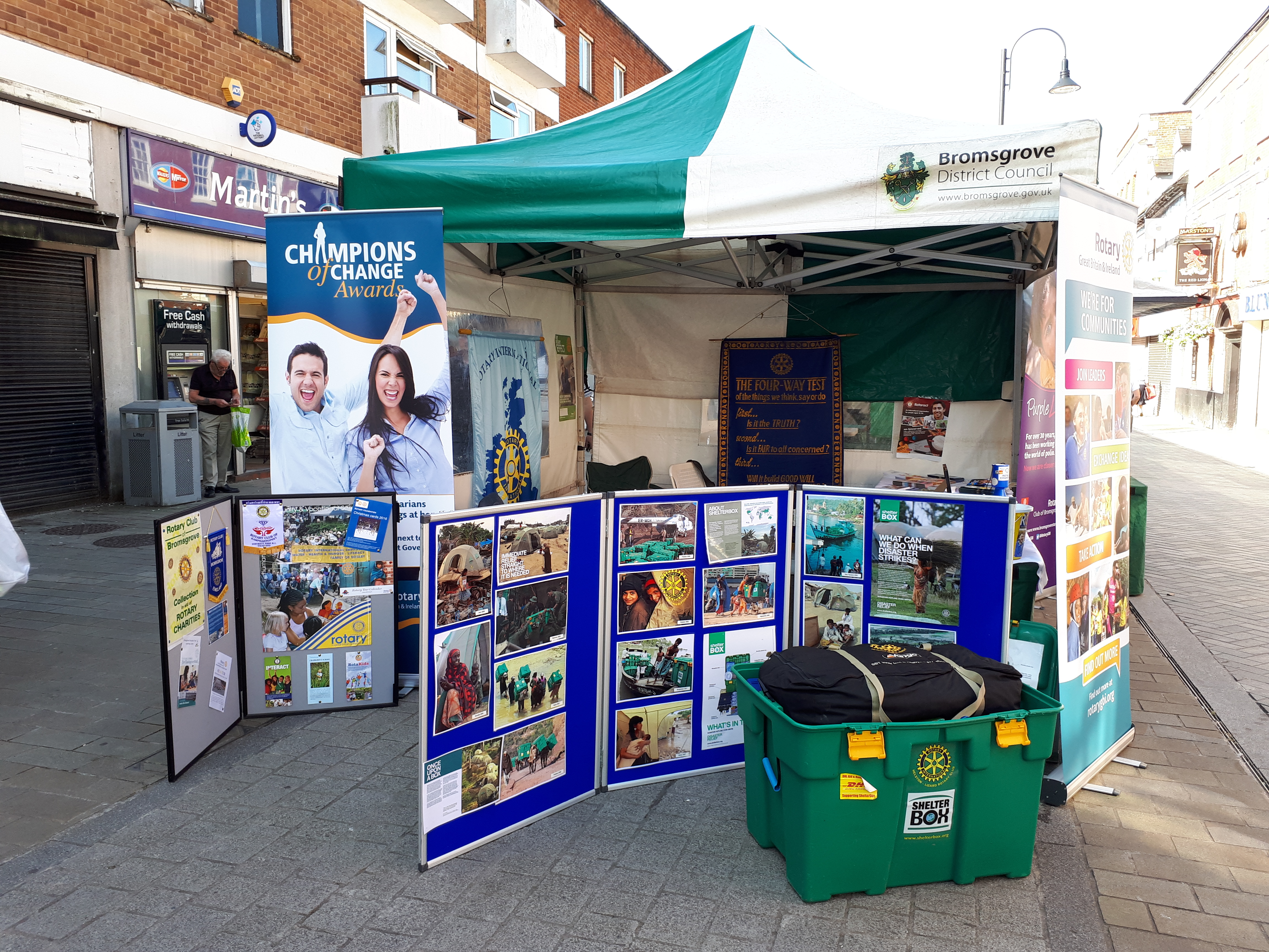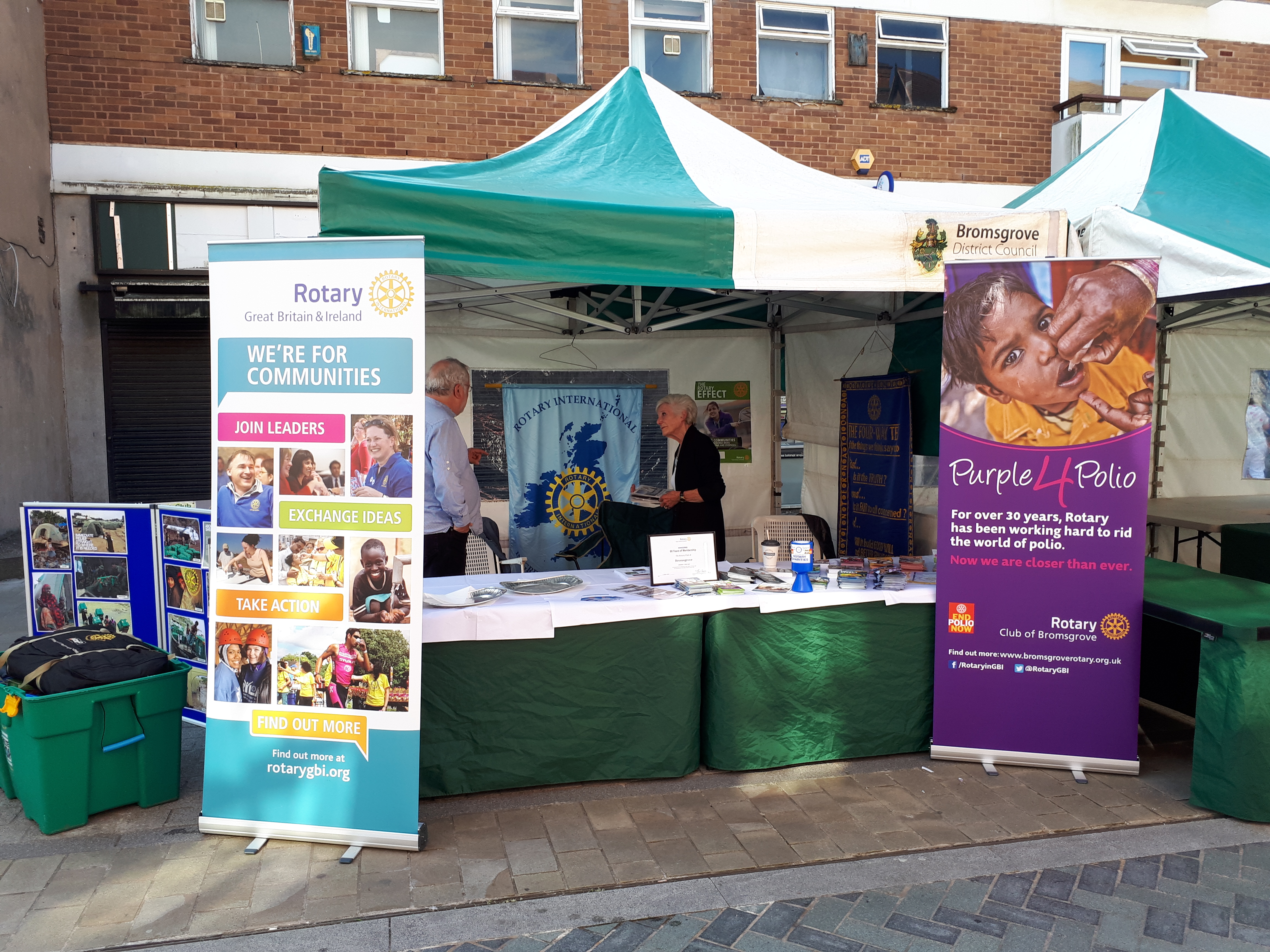 The Rotary Club of Bromsgrove ran a stall in High Street Bromsgrove from 11am until 3pm on 17 June as part of its 80th Anniversary celebrations. Members staffed the stall and took a street collection, helped ably by local Scouts and Guides who have benefitted from Rotary funding support during the year. Importantly, the event raised awareness with the public of what Rotary can do to help communities locally and abroad.