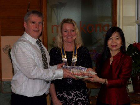 Following a successful charity dinner arranged for the Rotary Club of Bromsgrove at the Maekong Thai Restaurant in Bromsgrove on 19 January, Rotarian Tony Docherty and his wife Mu presented over £3000 to President Deborah Roberts to help fund an international charitable project in Thailand. A superb evening and meal contributed to raising money for this very worthwhile project.