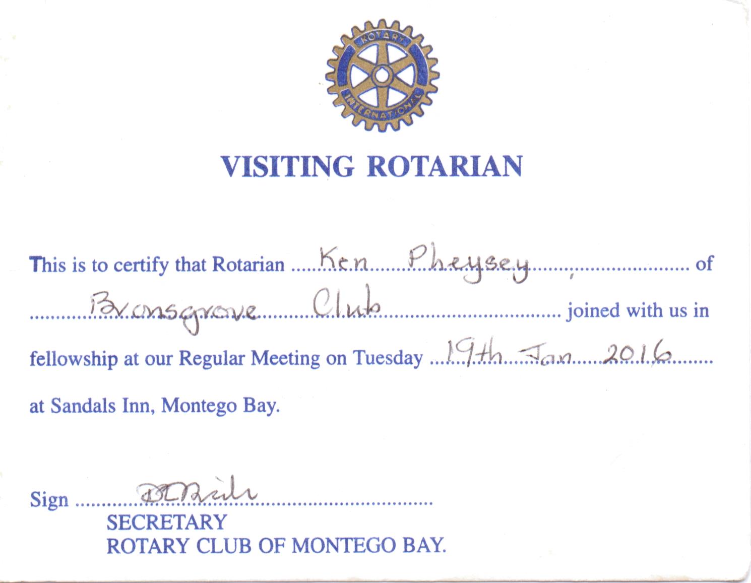 Rotarian Ken Pheysey visited Jamaica recently and took our greetings from Bromsgrove to the Rotary Club of Montego Bay.