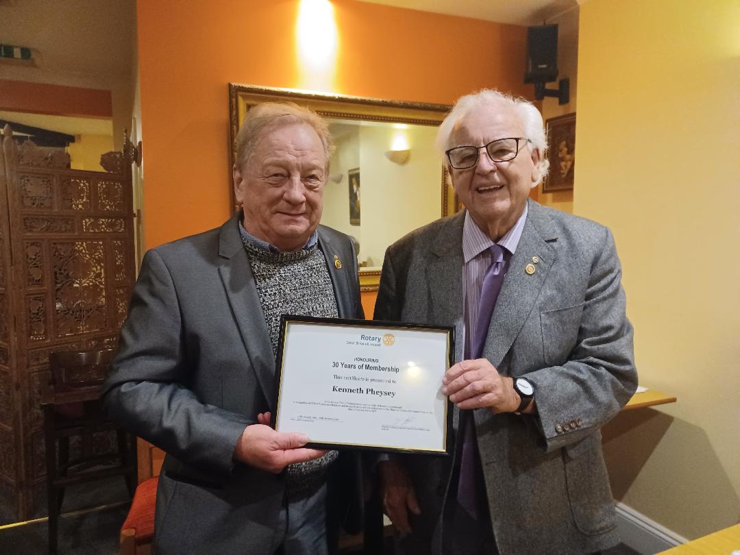 It was a great delight to see Ken Pheysey presented with his certificate to celebrate 30 years of service in Rotary at our Christmas party held at the Maekong Thai Restaurant on 8 December. The event was the first time we have sat down together for a meal for a very long time due to the current public health situation, and everyone enjoyed the evening immensely. Very many congratulations to Ken as a role model for ‘Service above Self.’ Pictured left is Ken receiving the certificate from our President John Teece.